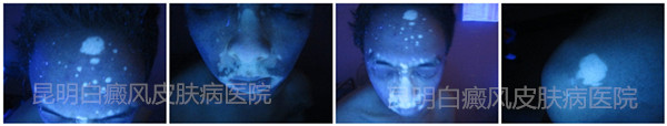 1、伍德灯:患者面部、额头等部位白斑色素脱失,界限模糊